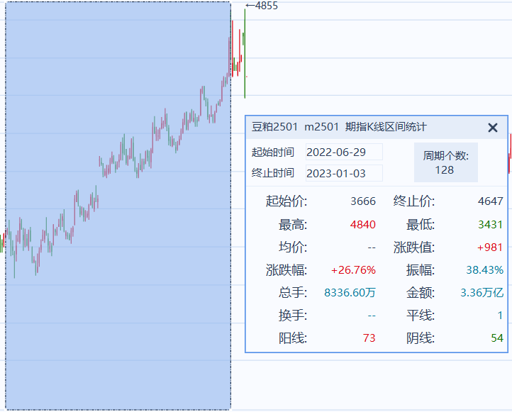 豆粕期货对应的标的物是豆粕现货,豆粕现货就是大豆压榨(就是榨油后剩余的杂质)后的附属品,主要用于家禽养殖行业,比如养猪,它的需求相对稳定,不排除个别时期需求对价格的影响,那大豆的价格波动就会影响豆粕现货的走势,豆粕现货的走势就影响豆粕期货的走势,从而导致购买豆粕期货的ETF基金的走势的变化,这里就产生了波动,这个波动周期是多久呢?这里先根据统计给出结果,一般是上涨和下跌在1到3个月左右,我们就拿比较长的时间来计算,上涨3个月,下跌3个月,一年是12个月,剩余6个月就窄幅波动,大家记住这里的时间,很重要!